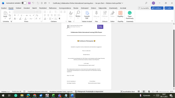 Ve dnech 20. října a 6. listopadu 2025, probíhal v rámci nové spolupráce s aliancí RUN-EU projekt COIL, a sice mezi Ekonomickou fakultou TUL a německou univerzitou Reutlingen. COIL (Collaborative Online International Learning – společné mezinárodní online vzdělávání) je online program, v rámci kterého studenti z různých zemí spolupracují na společném akademickém projektu v angličtině. Tato spolupráce pomáhá studentům rozvíjet mezikulturní, digitální a profesní dovednosti prostřednictvím týmové práce na reálných úkolech.