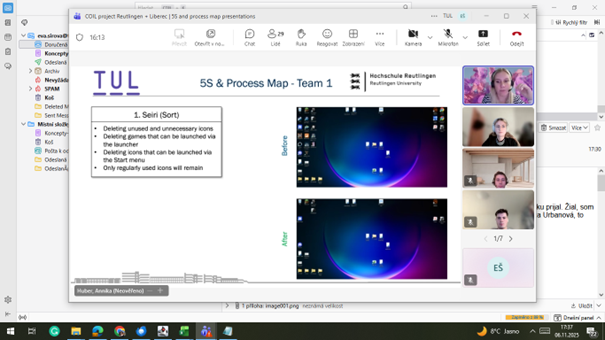 Během 2 týdnů studenti spolupracovali v rozdělených týmech na praktickém využití metody 5S, tedy pěti kroků k lepší organizaci a efektivitě práce – třídit, uspořádat, čistit, standardizovat a dodržovat. Každý tým si samostatně zvolil problém, který chtěl zlepšit, a podle těchto principů navrhl konkrétní řešení. Součástí projektu bylo také rozdělení úkolů v části nazvané „Map processing“, kde studenti analyzovali jednotlivé kroky procesu, určovali jejich pořadí a navrhovali způsoby, jak je zefektivnit. Témata prezentací se dost lišila – od uspořádání plochy v počítači, či uspořádání pracovní plochy stolu nebo skříně s oblečením. Kreativním nápadům se meze nekladly a celý projekt tak propojil teoretické poznatky s praktickým uplatněním.