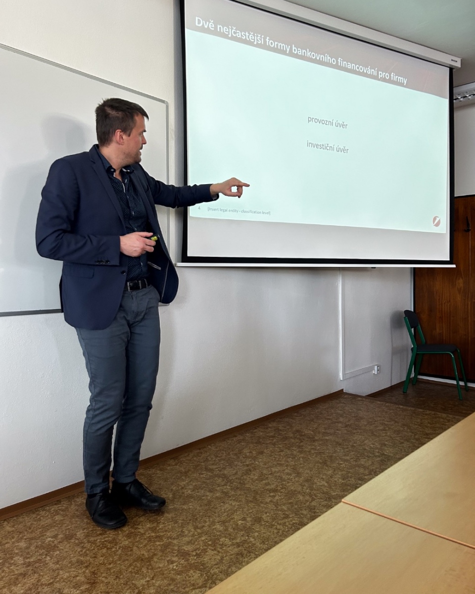 Hlavní část byla věnována dvěma základním typům financování – provozním a investičním úvěrům. U provozních úvěrů šlo především o jejich využití pro běžný chod firmy, například pro překlenutí krátkodobého nedostatku peněz. Přednášející vysvětlil jejich hlavní formy, výhody i omezení a ukázal, co všechno banky při jejich schvalování sledují. U investičních úvěrů se pozornost zaměřila na financování rozvoje firmy, například modernizaci výroby nebo větší investiční projekty. Důležité je zde zejména to, zda je investice návratná a jestli je firma schopná dlouhodobě vytvářet dostatek prostředků na splácení. Samostatným tématem bylo nastavení úrokové sazby. Studenti se seznámili s plovoucí sazbou, která se odvíjí od mezibankovních sazeb (PRIBOR u korunových úvěrů, EURIBOR u eurových) a je navýšená o marži banky. Vysvětlena byla také fixní sazba, sjednávaná na určité období, a základní principy sazeb vyhlašovaných bankami.