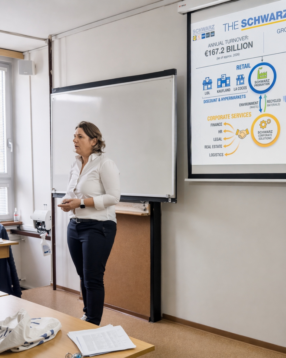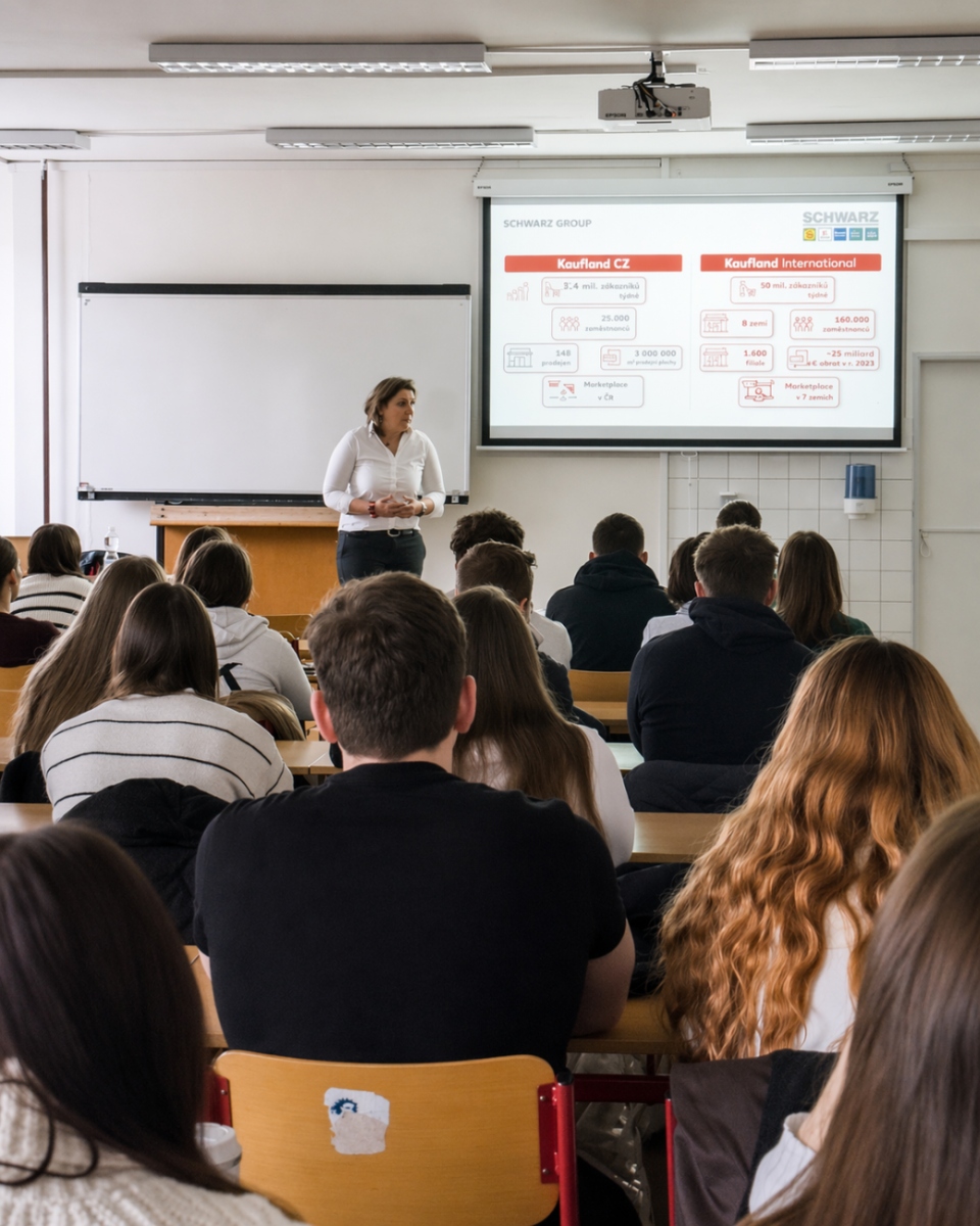 Významná část přednášky byla věnována postavení společnosti Kaufland, která patří mezi klíčové hráče českého maloobchodního trhu a současně je součástí nadnárodní skupiny Schwarz Gruppe, do níž spadá také Lidl. Tato skupina představuje jednoho z největších retailových hráčů v Evropě a její strategie je založena na kombinaci diskontního modelu, efektivního řízení nákladů a silného důrazu na privátní značky. Kaufland se v tomto kontextu profiluje jako hybridní formát mezi hypermarketem a diskontem, který kombinuje široký sortiment s cenovou konkurenceschopností a důrazem na zákaznický komfort. Jedním z klíčových přínosů přednášky bylo detailní představení celého toku zboží od dodavatele až po finální vystavení na prodejní ploše. Proces začíná výběrem a řízením dodavatelů s důrazem na kvalitu, cenu a stabilitu dodávek, pokračuje centrálním nákupem a plánováním objemů, následně přes distribuci do logistických center, kde dochází ke konsolidaci zboží a řízení zásob, a končí optimalizovanou dopravou do jednotlivých prodejen. V samotném místě prodeje pak hraje klíčovou roli merchandising, řízení dostupnosti zboží a celková organizace prodejní plochy. Celý tento řetězec je intenzivně podporován informačními systémy a analytickými nástroji, které umožňují minimalizovat ztráty, optimalizovat zásoby a zajistit vysokou úroveň dostupnosti produktů pro zákazníky.